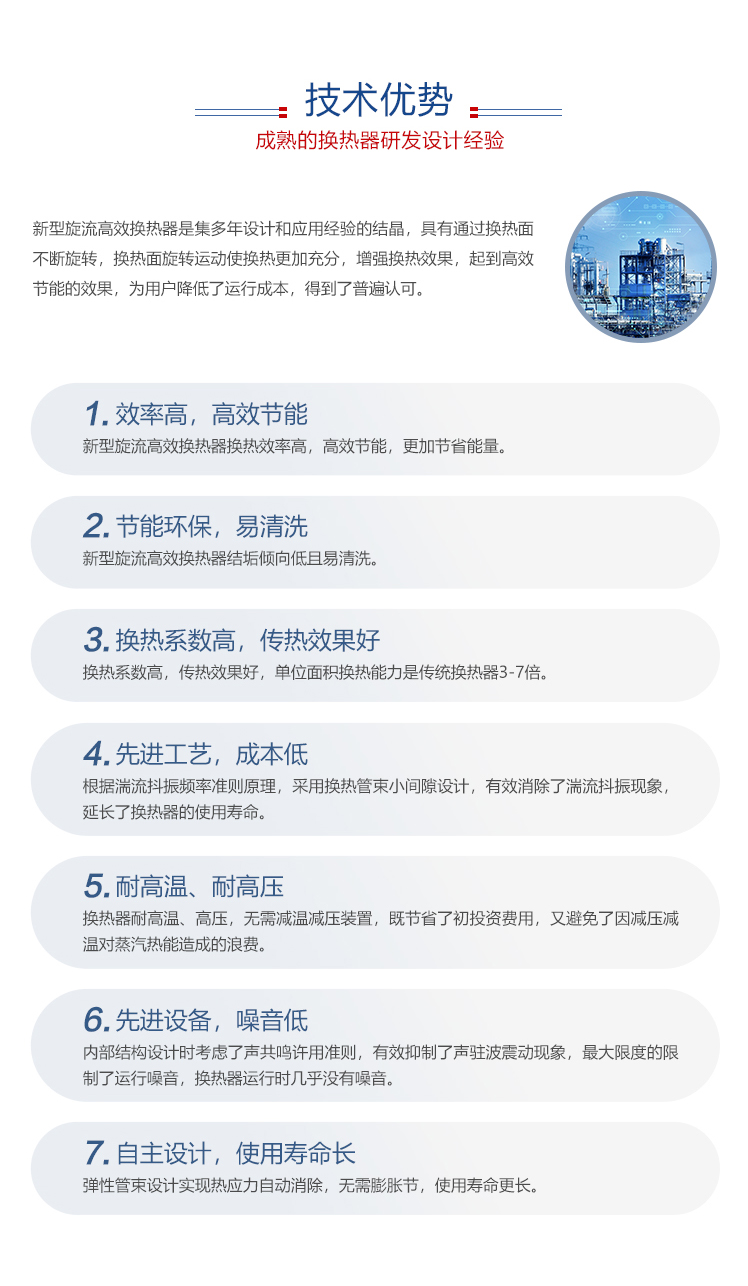 新型旋流高效換熱器是公司科研人員集多年設計和應用經驗自主研發的結晶,是國內首臺自動化換熱器廠家,開啟了換熱器走向智能化時代。新型旋流高效換熱器具有通過換熱面不斷旋轉,換熱面旋轉運動使換熱更加充分,增強換熱效果。具有溫差小,控溫準確,高效節能的特點。單臺面積的換熱能力是傳統換熱器的3-7倍,為用戶降低了運行成本,得到了普遍認可。通過大量的應用案例表明,我公司生產的換熱器應用優勢明顯,換熱面積大幅下降高效節能,能耗節約約10-35%,在溶劑回收工況,可提高溶劑回收效率3-5%。